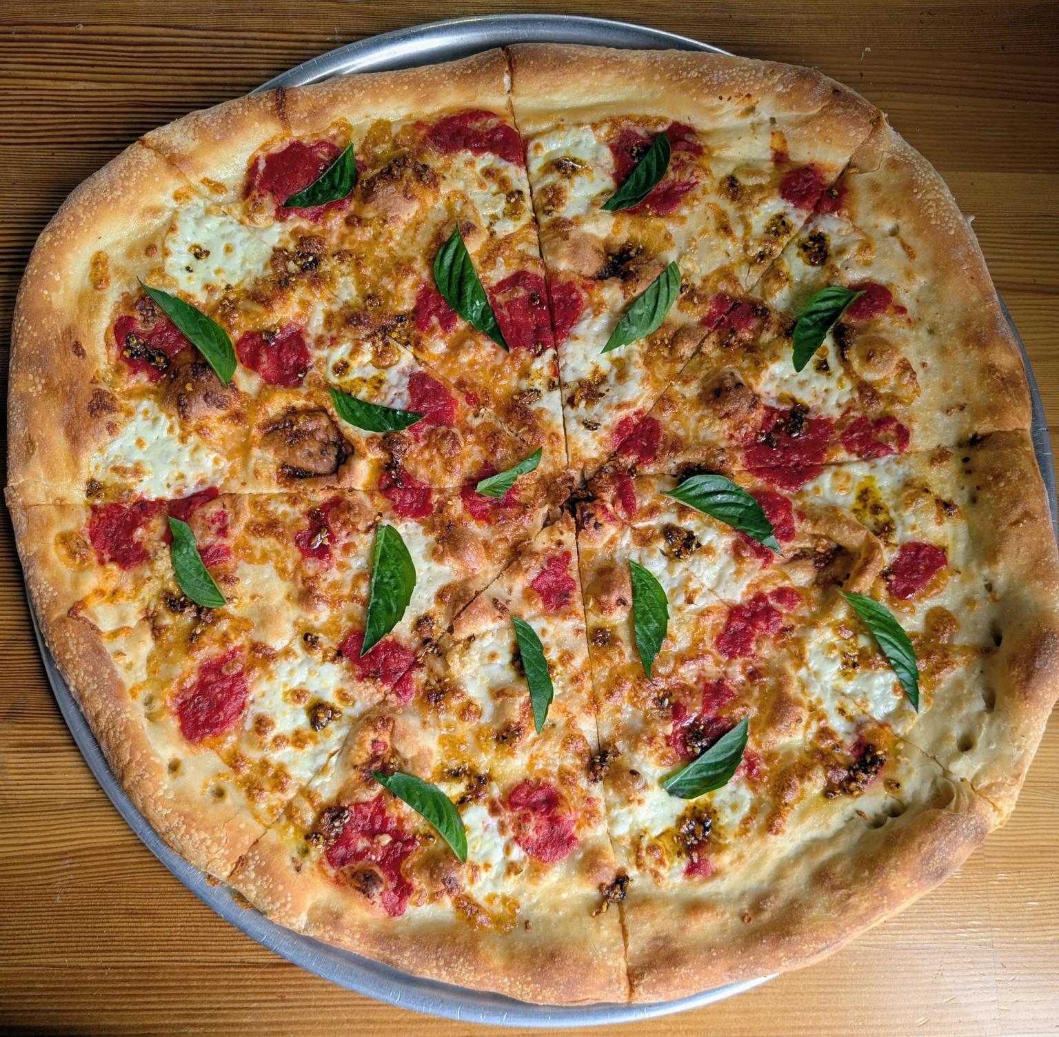 OLIVE OIL • LIGHT CHEESE • FRESH MOZZARELLA • CHOPPED GARLIC • RED SAUCE DOLLOPS • FINISHED WITH THAI BASIL & CHILI CRISP