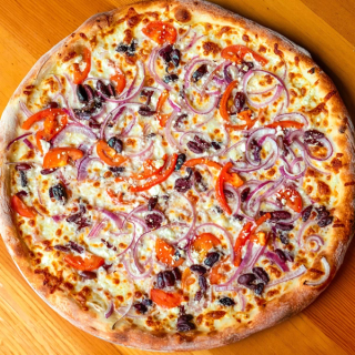 OLIVE OIL • CHEESE • RED ONION • TOMATO • KALAMATA OLIVE • FINISHED WITH FETA
