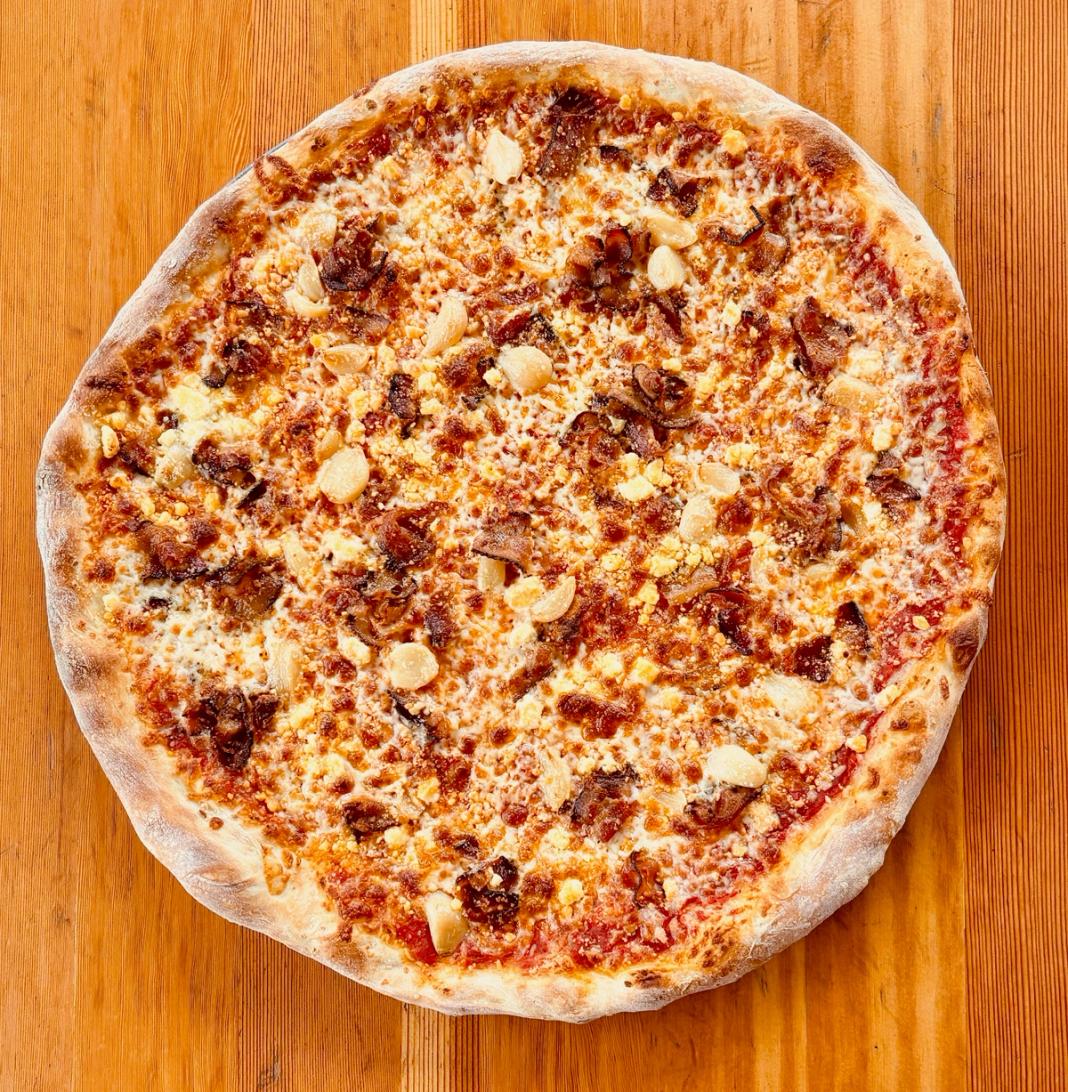 RED SAUCE • CALABRIAN CHILI OIL SPIRAL • CHEESE • BACON • ROASTED GARLIC • GOAT CHEESE