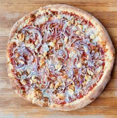 RED SAUCE • FOLLOW YOUR HEART VEGAN MOZZARELLA • VEGAN SAUSAGE • RED ONION • ROASTED GARLIC • CALABRIAN CHILI • BASIL